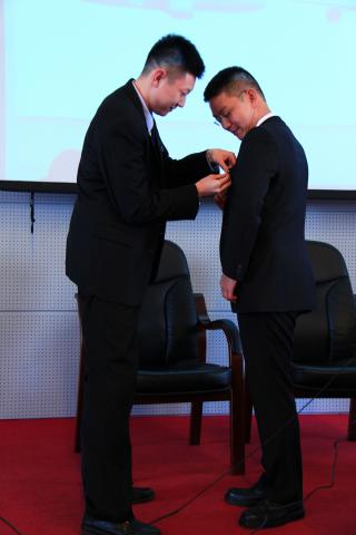 演讲结束后,Sheffield先生热情的邀请现场学员提问,同学们积极提出了自己的看法。Sheffield先生对每一个问题都进行了非常详细的解答,并为他认为提出“最好的三个问题”的学员赠送纪念品。随后,学生代表陈天石同学为Sheffield先生佩戴了象征北航飞行学院的小金鹰,全体到场人员再次鼓掌,对空客公司团队的到来表示感谢。讲座在掌声中圆满结束。