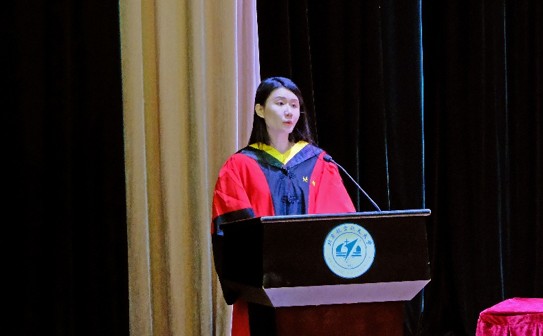 教师代表邱华鑫为全体毕业生送来了嘱托和期许,向各位同学顺利毕业致以热烈祝贺并送上美好祝福。她嘱咐同学们要平和、善良、热爱世界,祝福同学们在人生的航道上,遇强风亦可破浪千重,逢骤雨且敢振翅九霄!