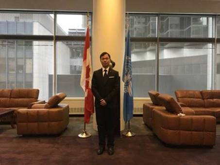 11月27日,代表团来到蒙特利尔的第二天,是ICAO-NGAP全球峰会的正式召开首日。当我们一早抵达会议地点--国际民航组织ICAO总部大楼,立即感到ICAO总部作为联合国附属机构的庄严以及ICAO-NGAP首届峰会的盛大。27日-28日的首届国际民航组织ICAO-NGAP全球峰会吸引了世界五大洲共计600余名航空领域专家学者、政府部门负责人、民航业内相关企业代表及青年学生代表团等与会共商民航业人才培养。对于参赛学生来讲,是参加ICAO-NGAP峰会的两部分内容,首先作为代表参加ICAO-NGAP峰会的大会部分,然后是作为学生辩论赛选手参加ICAO-Model的辩论环节。所以飞行学院的六名学生具有参会者的双重身份。这期间,因为网上注册的小失误,害得周天成同学颇费周折才拿到了参加全部会议的双重身份代表证。