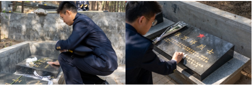 随后,同学们登上青山,参观烈士陵园。同学们自发用纸巾为烈士墓碑拂去尘土,将散落的鲜花摆放整齐,以实际行动表达对先烈的敬意。