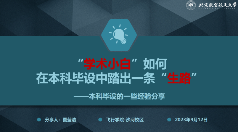 王丹首先系统的讲解了本次毕业设计的整体流程并强调了毕设纪律。随后,章文晋教授分享了以《本科毕业设计ABC》为题的专题培训。邱华鑫老师、王柳青老师及来自航空科学与工程学院的北京市优秀本科毕设、校级优秀论文获得者夏莹洁分别以《毕设论文的规范化写作》、《如何把毕设讲顺》、《“学术小白”如何在本科毕设中踏出一条“生路”》为题,从不同角度对如何做好毕设进行了分析。