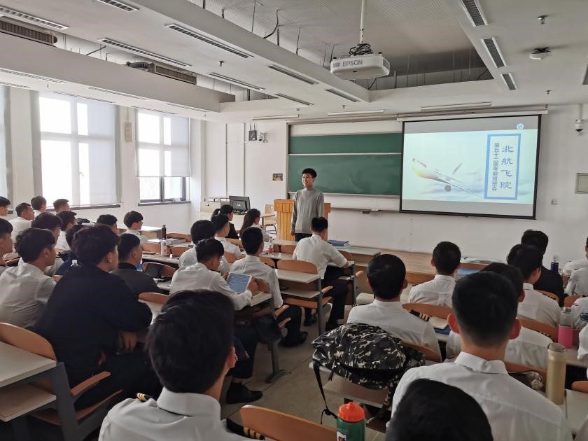 2019年11月13日,飞行学院2019级全体学员在沙河校区教0-003开展了“铭记历史不忘初心牢记使命传承精神”主题班会。由于考期将至,因此在活动开始前老师给学员们做了有关考场纪律的思想工作。随后,张军奇指导从中国航天工业的角度开展了本次班会。